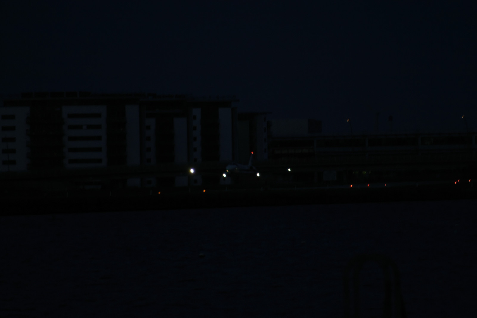 plane comes in to land in the dark
