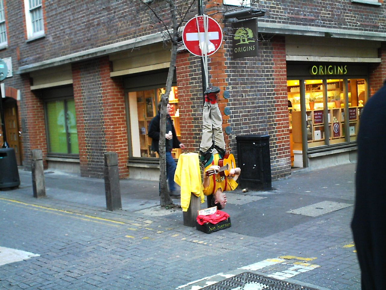 There's a man here. And he's playing the guitar upside down!