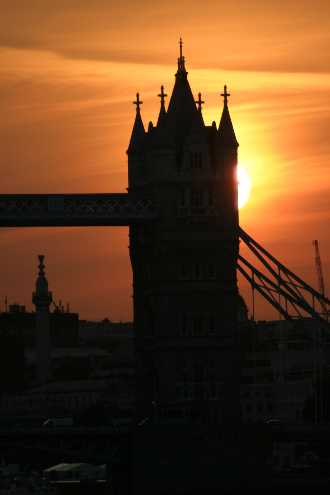 The North tower of Tower Bridge silhouetted by the setting sun