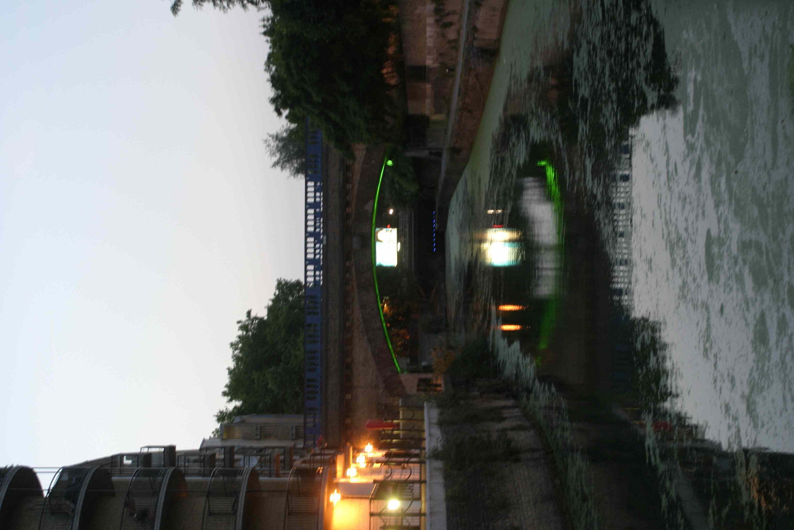 Limehouse Cut canal. Slow exposure...was actually darker than this, but it brings out the green of the floodlights. The white square that looks like a patch of sky under the bridge is actually a billboard on Commercial Road.